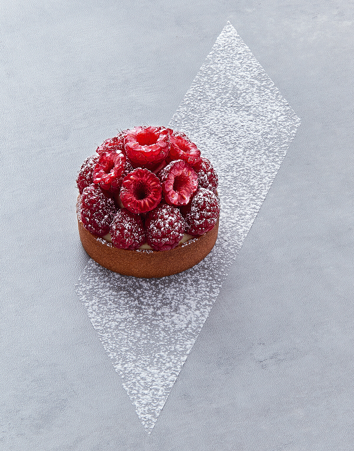 組合與裝飾:將烤箱預熱至170℃。在塔底塗抹一層杏仁奶醬,進入烤箱烘烤四分鐘,出爐後置於烤架上冷卻。將覆盆子內餡裝入擠花袋中,在冷卻後的杏仁奶醬上擠上薄薄一層,剩下空間再用薄荷奶醬填滿。塔上以螺旋迴圈的方式擺放覆盆子,最後再撒上糖粉即成。