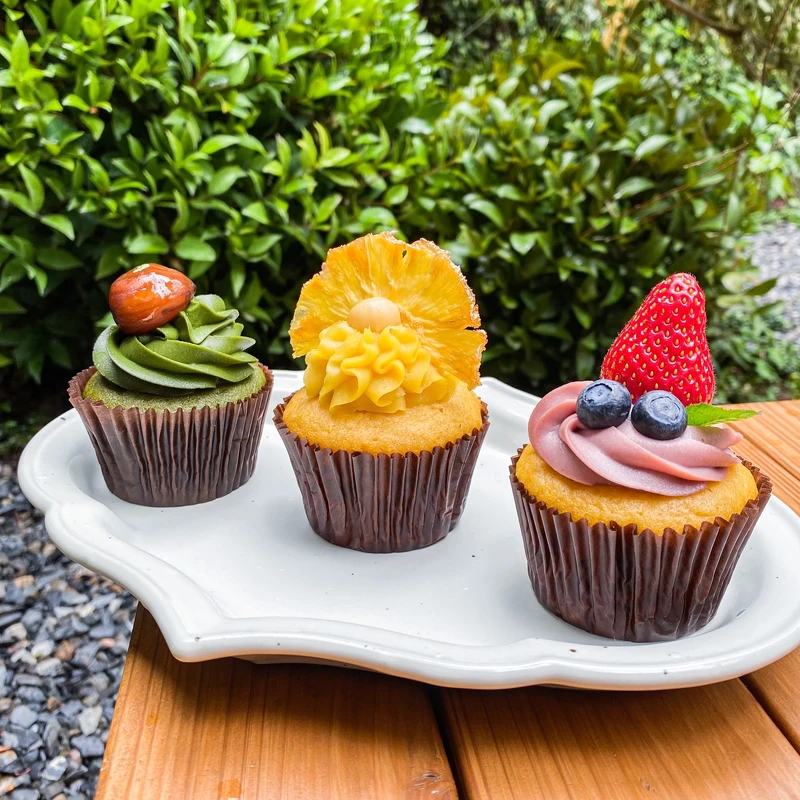 市售杯子蛋糕的靈魂在於頂端美麗誘人的鮮奶油,但其實添加大量的牛奶、奶油、糖粉、人工色素常讓人又愛又怕。但綠帶杯子蛋糕的美麗擠花,則使用新鮮的地瓜、紫薯、腰果經繁複的手工處理成泥,添加新鮮蔬果自然呈現鮮豔的色彩。