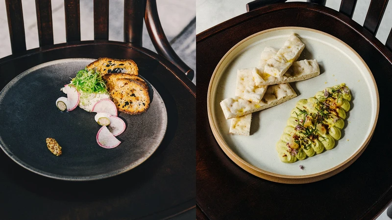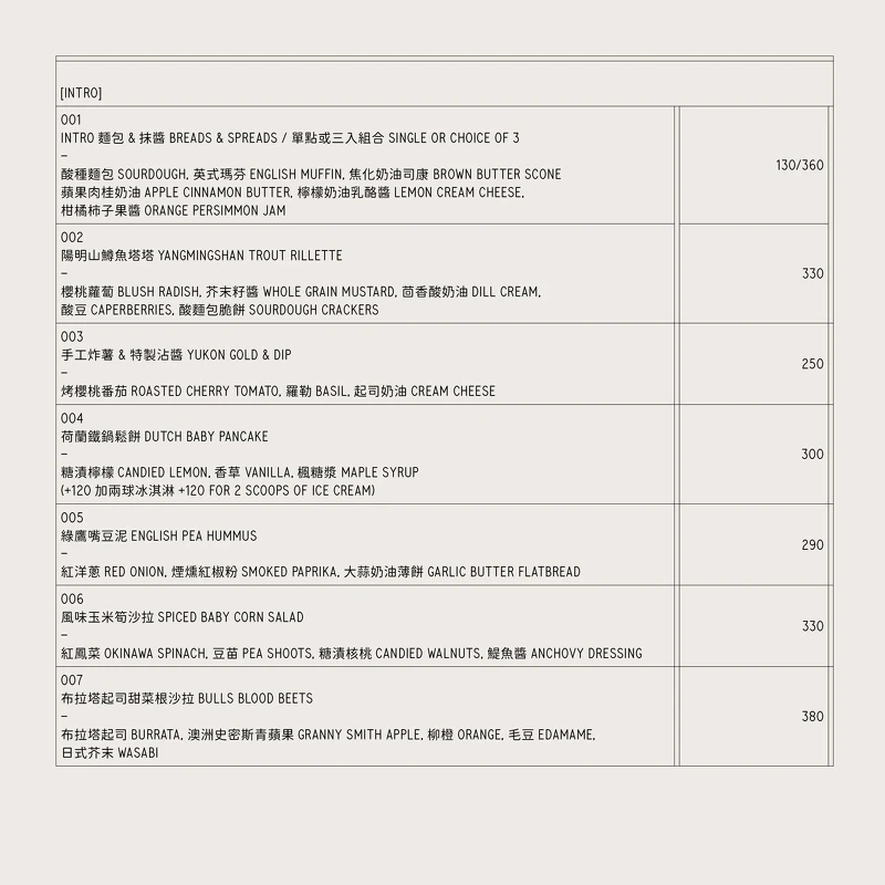 來到《INTRO》,推薦前菜可點「英式瑪芬」、「焦化奶油司康」、「綠鷹嘴豆泥」以及「陽明山鱒魚塔塔」,其中「陽明山鱒魚塔塔」啟發自傳統法式料理,將特選鱒魚慢煮於牛奶,再加入芥末籽醬、茴香酸奶油、酸豆、櫻桃蘿蔔,口感綿密又有酸香滋味。