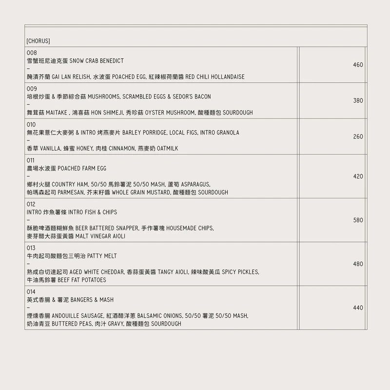 而主餐除了「INTRO 炸魚薯條」、「牛肉起司酸麵包三明治」外,則可以試試「雪蟹班尼克蛋」,將雪蟹餅搭配上手作英式瑪芬,淋上紅辣椒荷蘭醬,絕對是驚喜味蕾的新選擇。