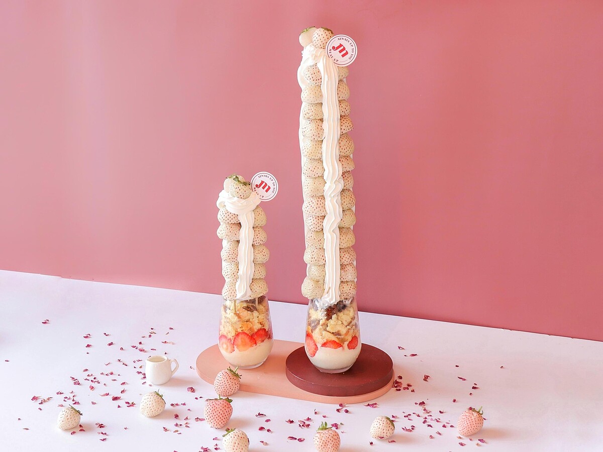 繼之前推出草莓舒芙蕾、草莓巴斯克乳酪蛋糕,還有超浮誇的草莓高塔後,這次打造夢幻十足,吸睛度破表的白草莓系列甜點,除了有新款蒙布朗草莓舒芙蕾、爆量草莓舒芙蕾,以及結合甜點杯的草莓芭菲外,這次最吸睛的就是把浮誇草莓塔變成白裡透紅的淡雪草莓,草莓控準備好衝一波!
