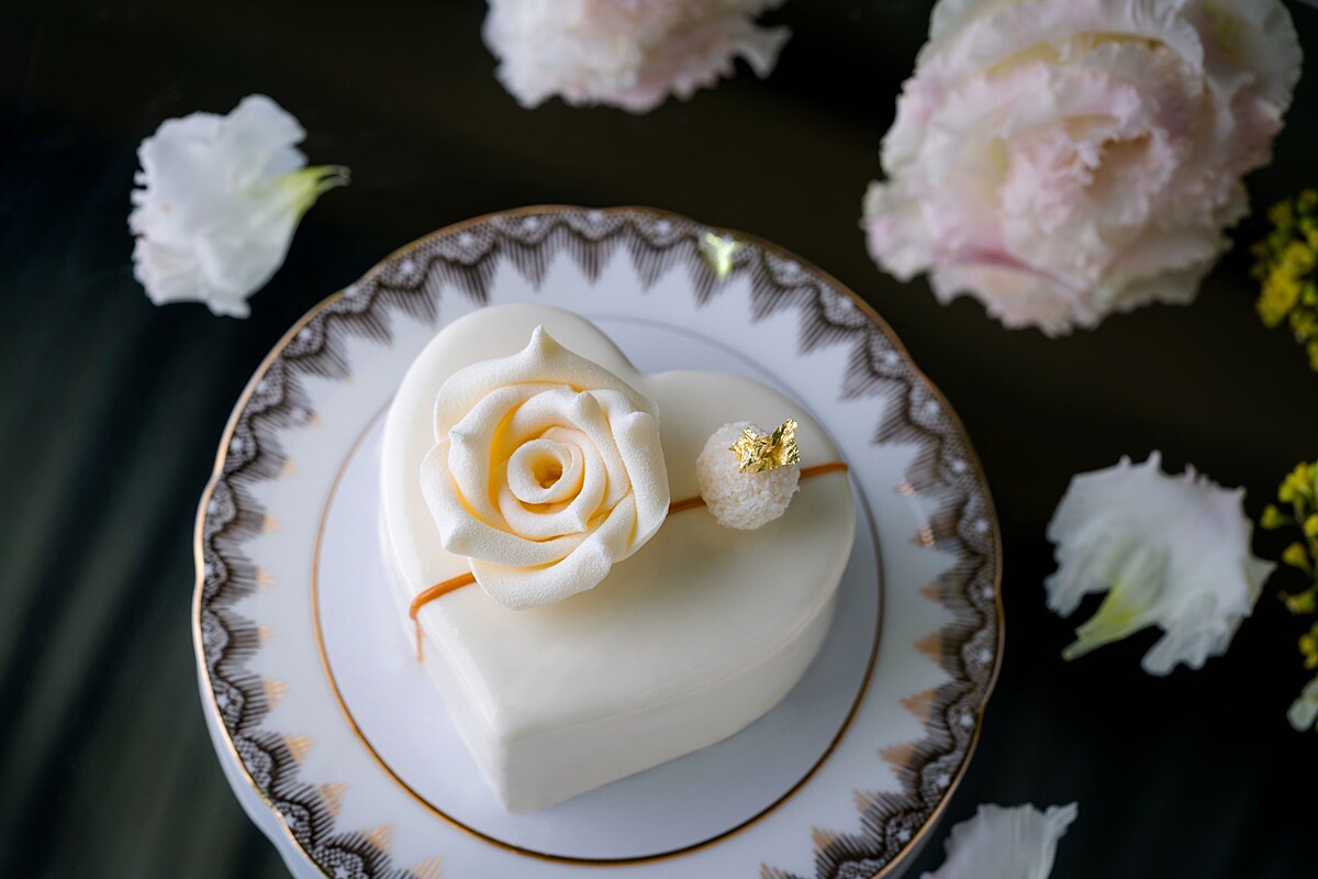 白玫瑰花語有著「純潔、無瑕的愛」的浪漫含意,「花舞戀曲」玫瑰櫻桃蛋糕基底是口感細緻的戚風蛋糕,外層再淋上白巧克力醬打造出純白的立體愛心造型。