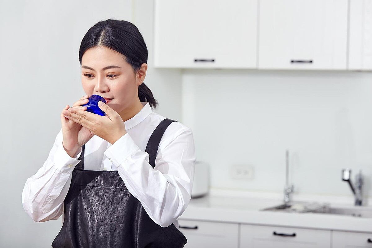 Step 3:將鼻子湊近杯子深呼吸,聞聞橄欖油的味道。不同品種的橄欖油可能會有不同的味道,有的是果香、有的會帶有草香,有經驗的品油師還可以判斷出核果香、香蕉、蘋果等等細微的味道;但如果聞到霉味、酸味或油耗味,則有可能為劣質油。