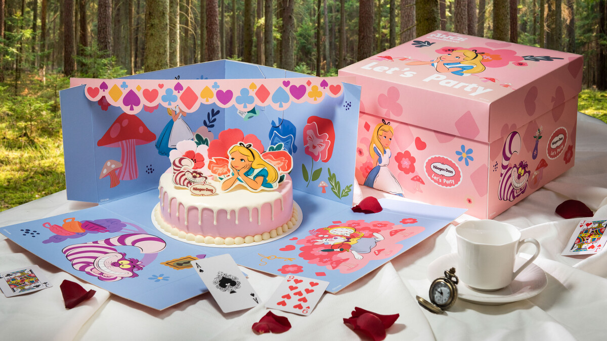 愛麗絲首度現身Häagen-Dazs冰淇淋蛋糕啦!禮盒內外以童話故事元素為主軸,讓大家彷彿置身紅心皇后的茶會中,跟著白兔先生與笑臉貓一起展開味蕾的夢幻旅程!冰淇淋蛋糕則由酸甜芒果雪酪搭配藍苺冰淇淋,雙重風味讓人一吃就愛上!
