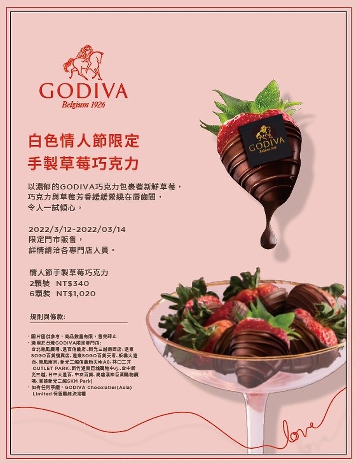 情人節就是少不了甜蜜巧克力,每推出就大受歡迎的GODIVA手製草莓巧克力,在2022年白色情人節回歸,將整顆新鮮草莓裹上濃郁GODIVA巧克力,實在太誘人。
