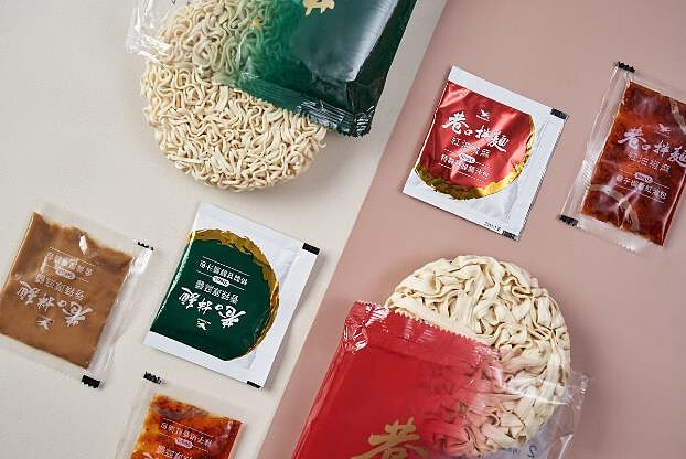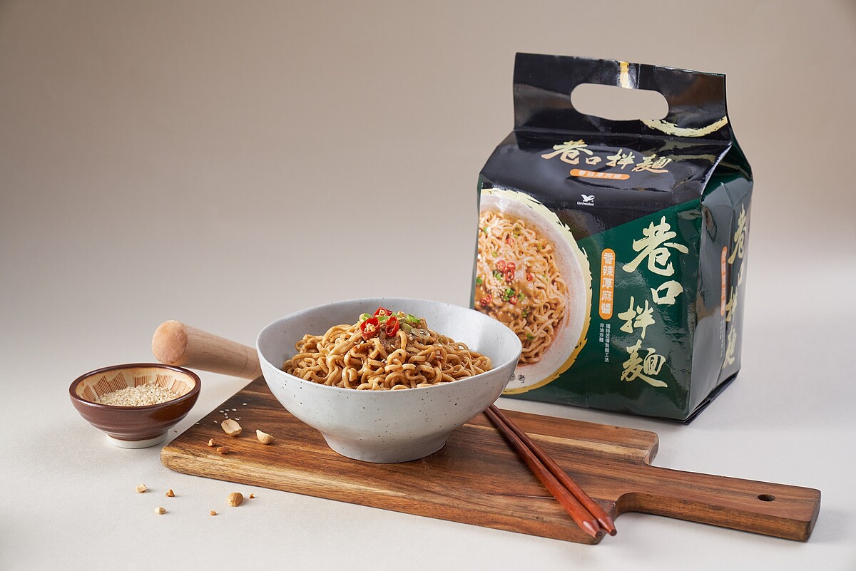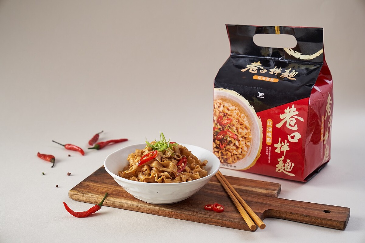 《巷口拌麵》的麵體使用匠傳製麵工法,十八道工藝麵條透過九道壓延工序以及九道熱風烘乾製程,強化麵體筋性,兩款分別是6mm捲Q龍捲麵與2mm Q彈細麵,滿足不同麵食控的口味。