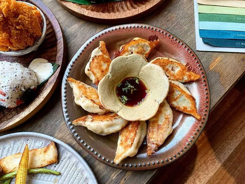 老宅改造的質感小店,裝潢設計與寧靜輕鬆的氛圍,復古帶點日式的文青感,讓人坐在店裡享受清幽時光!而人氣必點美食為飯糰有參粒 $220,三角飯糰擺盤精緻且可愛,每個飯糰內餡都有不同的滋味,分別是醬燒杏鮑菇/吻仔魚/小魚乾,米飯的口乾軟硬度適中,香氣撲鼻,而雞肉煎餃也是來到此店必點美食$150。