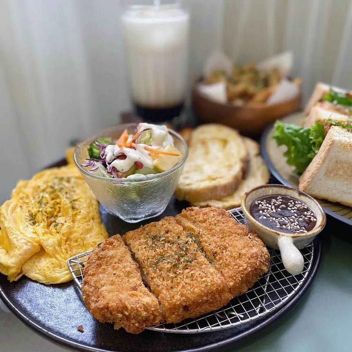 藏在巷弄內的高CP早午餐「米庫」,每到營業時間都座無虛席,超人氣必點美食日式厚切炸豬排早午餐 $250,外酥裡嫩肉質飽滿,口感紮實,香嫩不柴,而韓式燒肉起司蛋厚切吐司套餐 $215,也非常多人喜愛,份量大,男生也能吃出飽足感喔!