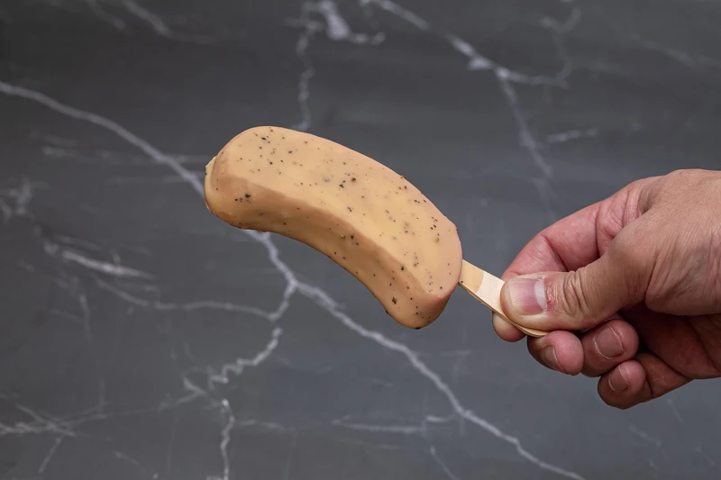 這支「蜷尾家莓果冰棒」外型如糯米腸,其實是白巧克力,包裹綜合莓果雪酪,加上些許胡椒粒點綴,看起來宛如台式小吃大腸包小腸,吃起來則是酸甜美味。