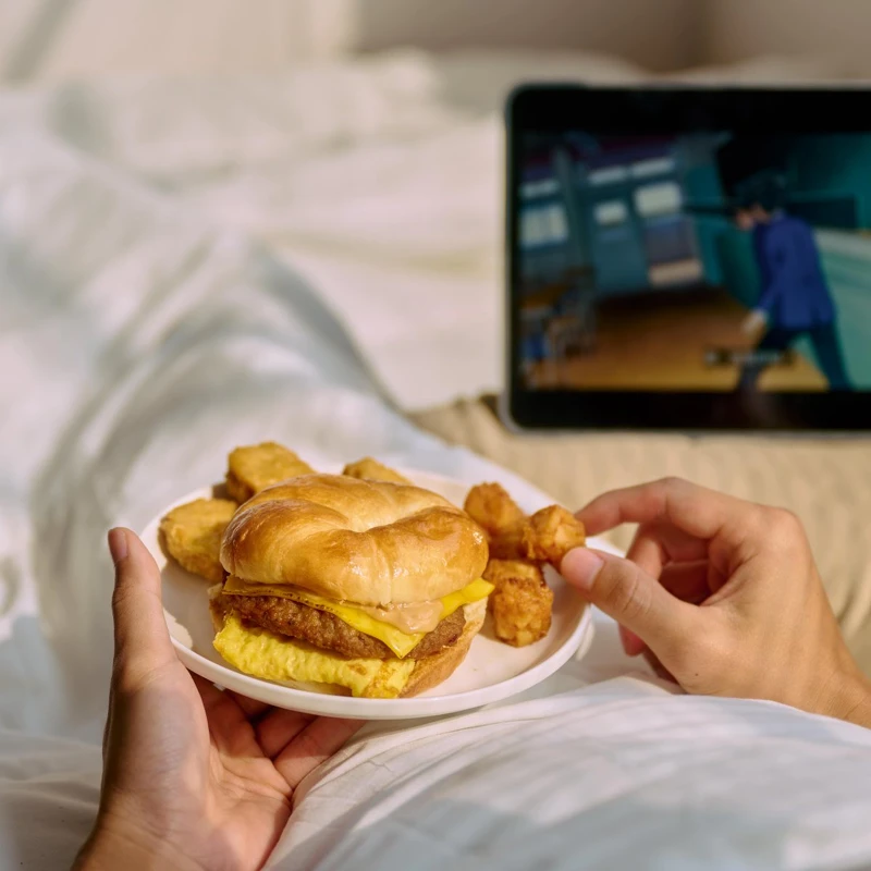 使用獨家秘製的脆雞搭配新鮮蔬菜,再加入香煎的牛奶蛋、鬆軟華頌,用美味開啟正能量的一天。