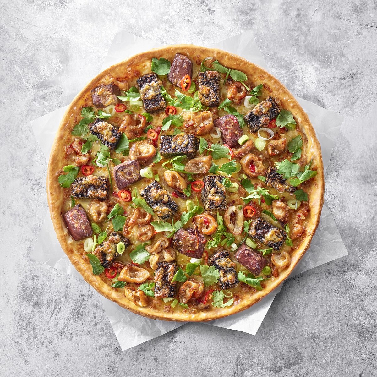必勝客「香菜豬血糕五更腸旺比薩」即日起限時限量開賣,限定搭配薄脆餅皮,單點一個大比薩優惠價399元,也能以原價780元搭配外帶買大送大或外送買大送小比薩優惠。