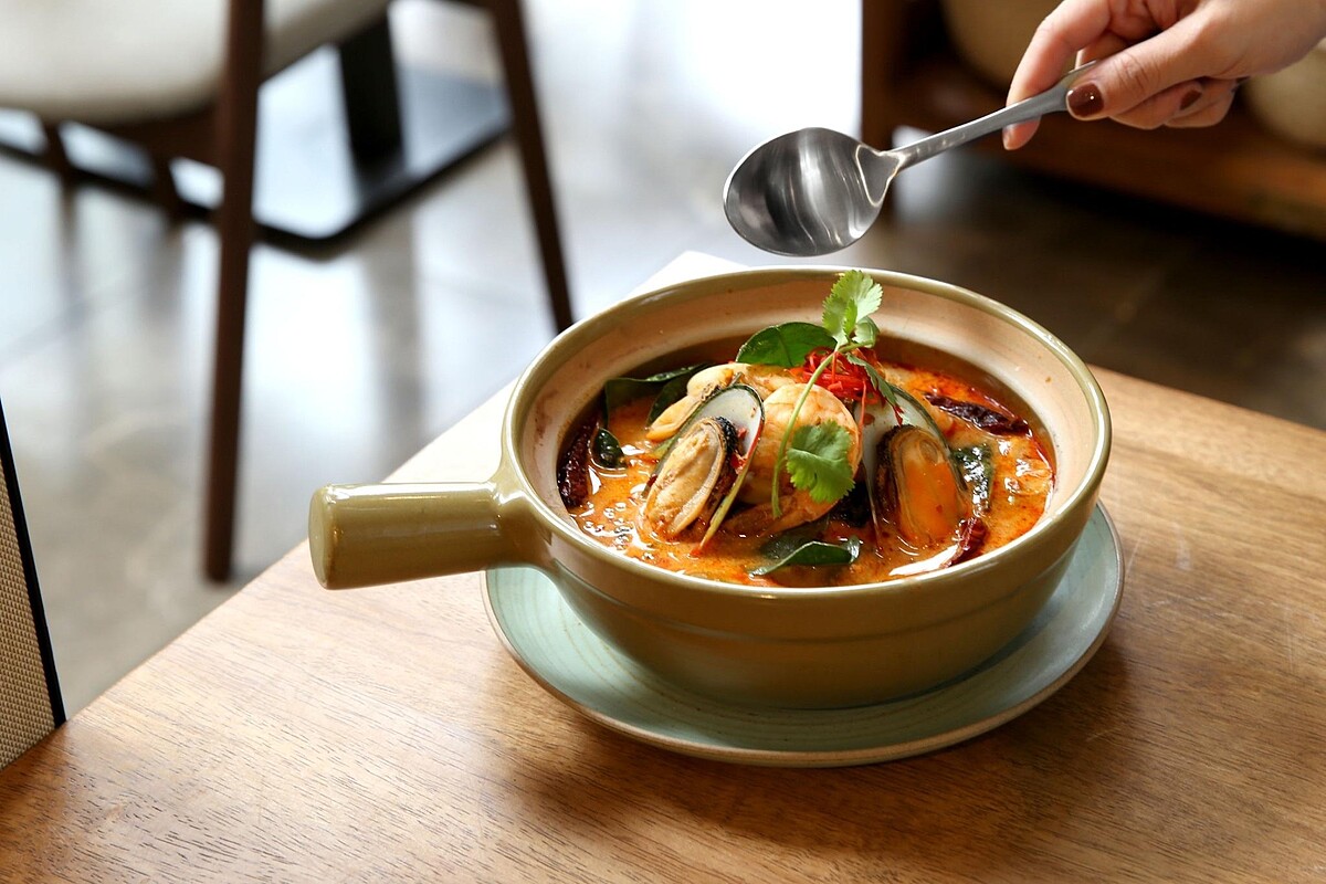 使用冬蔭功醬、香茅、南薑、檸檬葉、辣椒、魚露、赤芹、淡奶、青檸燉煮,並加入淡菜、花枝、鮮蝦。濃郁香辣、酸口感。