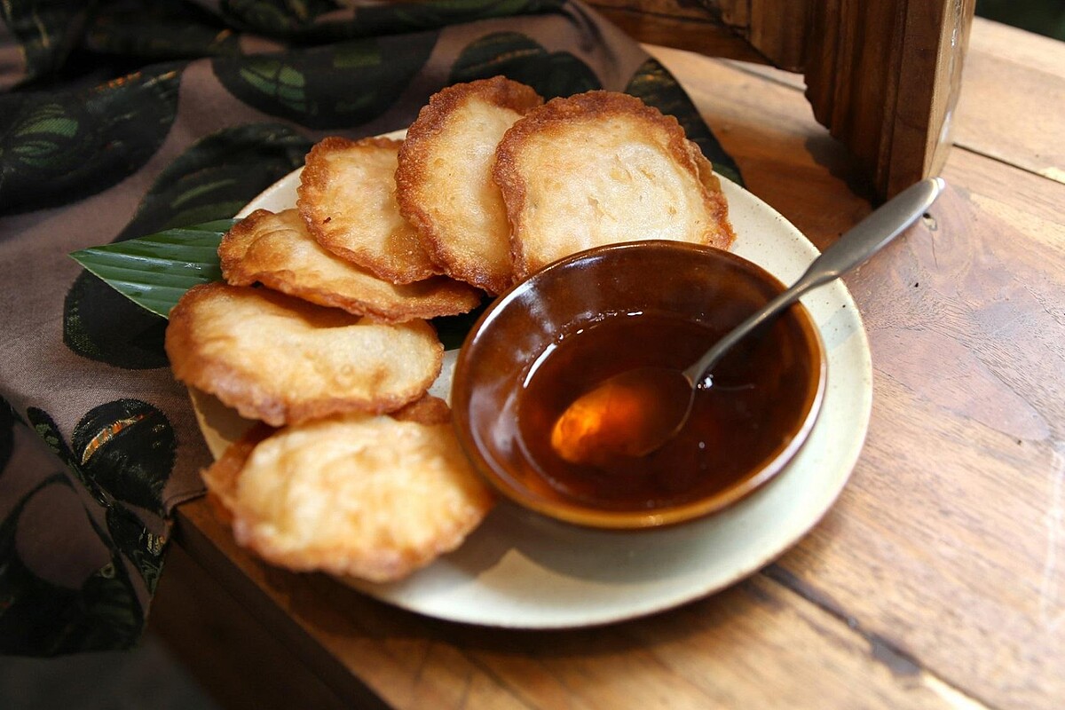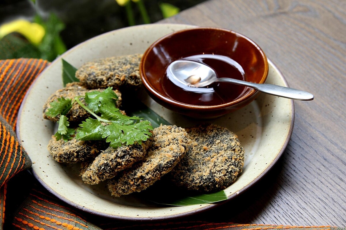 內餡加入草蝦仁、花枝、香菜、香茅製作而成,這款蝦餅特別加入了竹炭粉,香氣四溢,口感酥脆,讓人一吃就愛上!