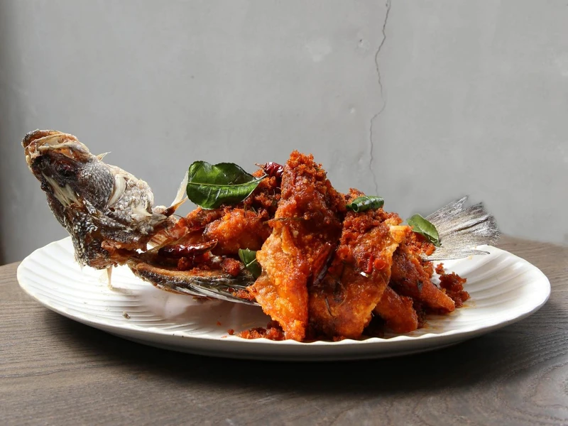 這道泰菜是泰國御廚為不喜歡魚刺的王子剔除魚骨所做出的經典料理,將金目鱸魚去骨肉,將魚刺去除,炸至金黃酥脆,使用特製的泰式紅醬拌炒後,最後再撒上紅醬鱸魚魚酥,搭配飯一起享用真的超開胃!