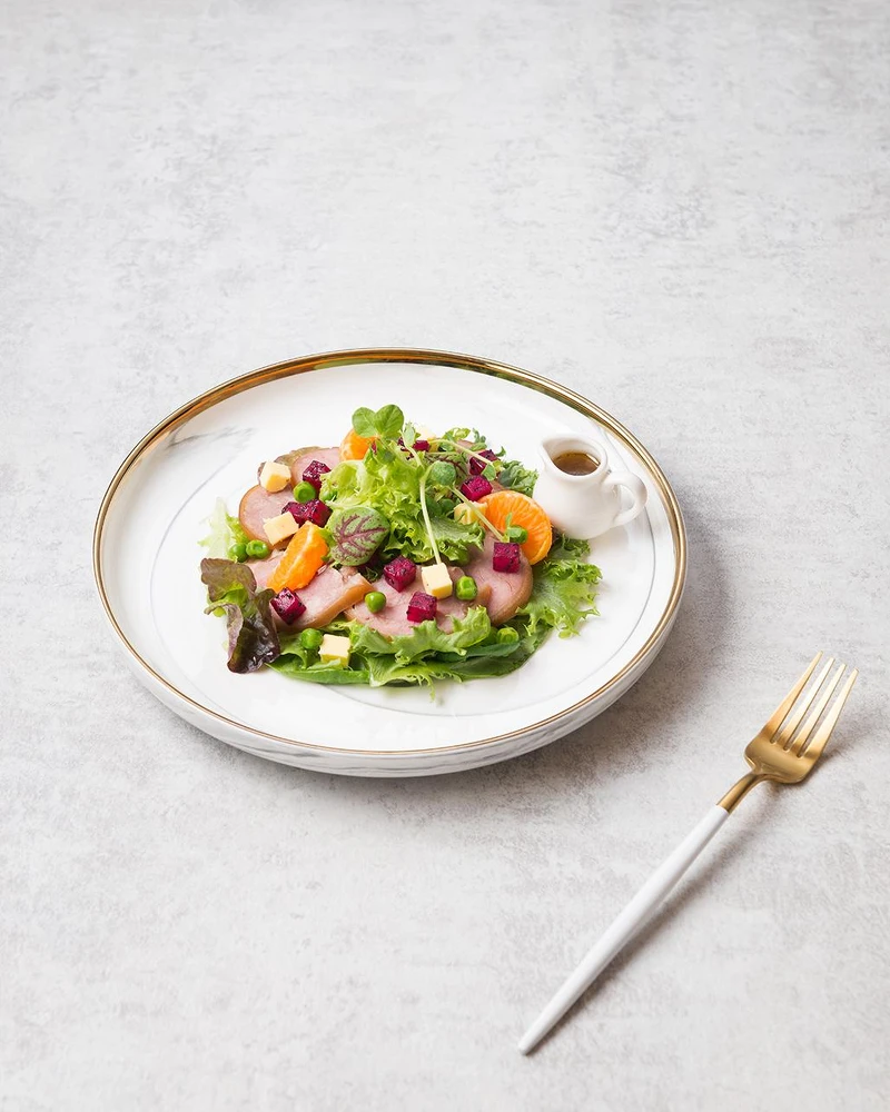 4、接著將生菜、水果、紮蹄及起司丁組裝盛盤,要食用時淋上油醋醬即可