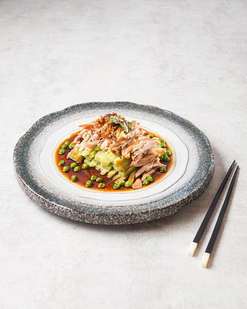 6、豌豆粉凝固後,切成條狀,並將條狀豌豆粉及撕好的油雞組裝,最後淋上XO醬料即完成