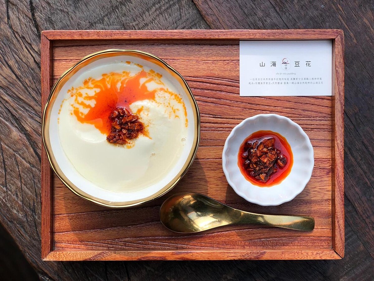 這款限定版豆花以日式味噌、蒜頭、辣椒、與特調豆漿製成的鹹味豆花,其實跟台灣的鹹豆漿有著異曲同工之妙,入口感受濃郁蒜香、香而不激辣,再搭配綿密的豆花,整體味道不會突兀,反而很涮嘴!