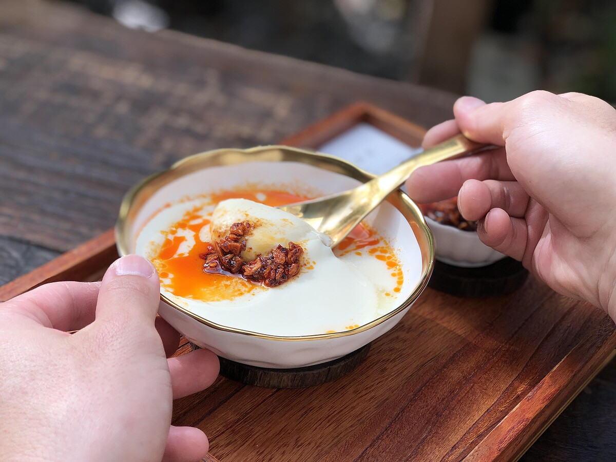 除了甜豆花外,居然還有鹹辣豆花!源自YoShi優喜於童年裡的味道,回想起小時候常常吃到媽媽在豆腐店買的「寄せ豆腐」,接著再淋上辣椒油,美味在口中無限蔓延!