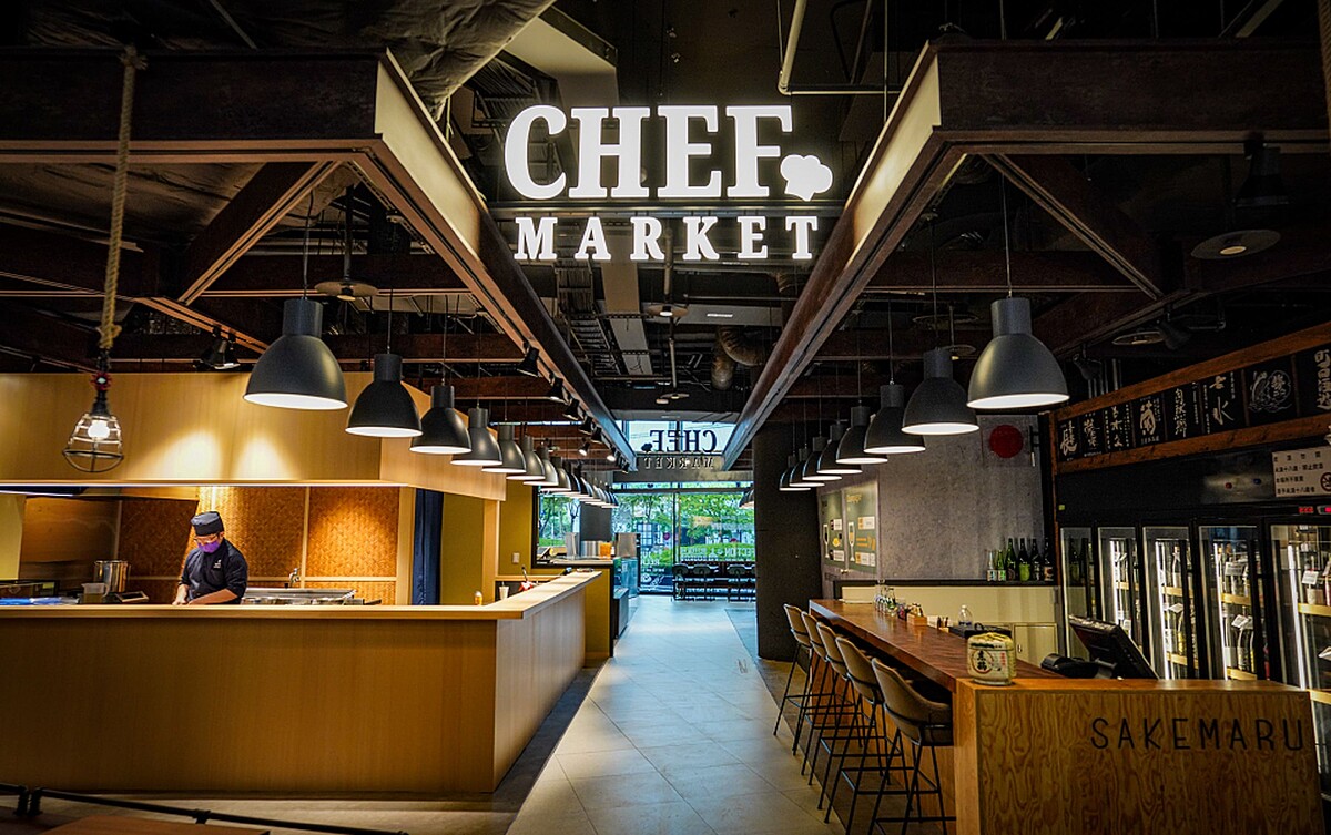 踏入主廚市場映入眼簾的是寬敞的走道,與挑高13米的空間,不到70席的座位席,空間寬敞明亮,整體氛圍舒適愜意!主廚市場打破了用餐的框架,更鼓勵大家跨店依照喜好選擇餐食,像是可以在「瞞著爹」立吞店享受招牌散壽司的同時,點一杯「Taipei wine co.」的頂級酒藏,讓大家隨心所欲選擇喜愛的料理!