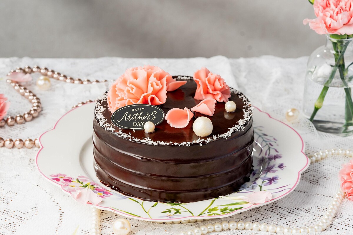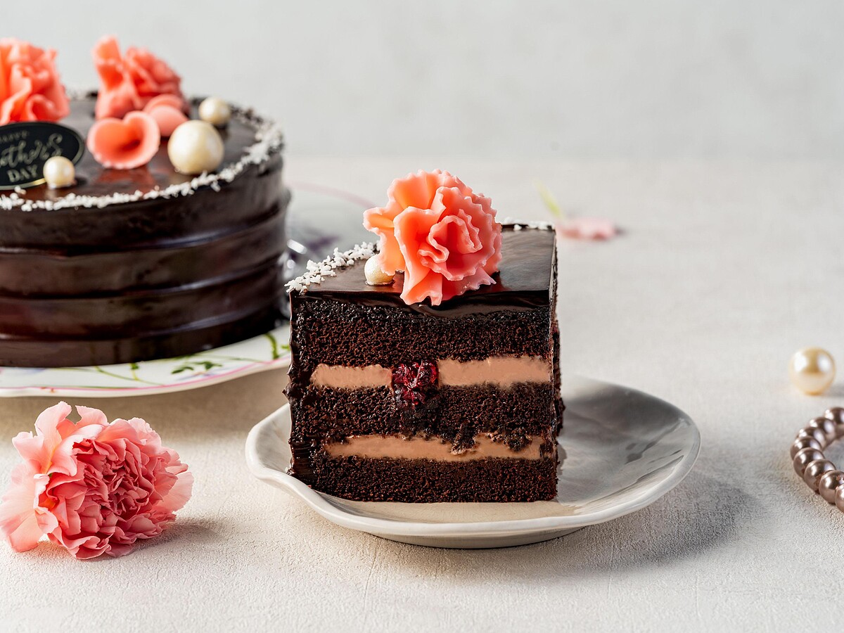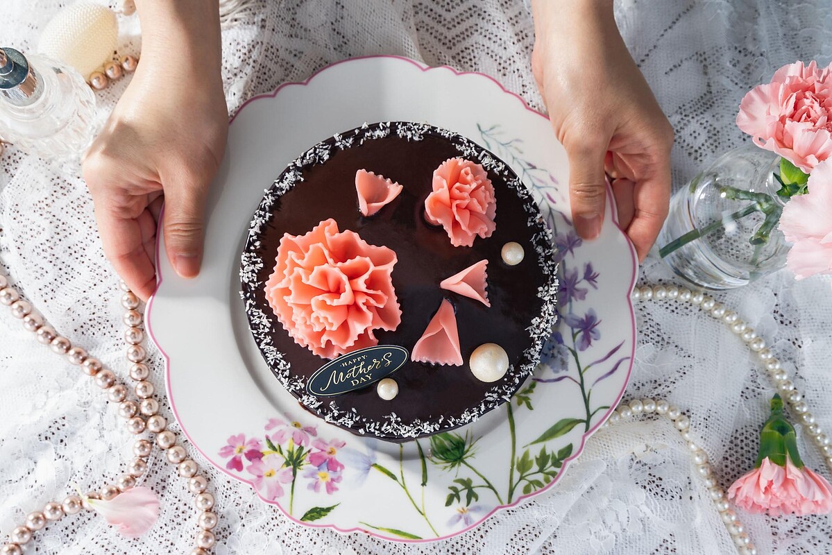 以湯種巧克力戚風蛋糕為基底,外層再淋上經典生巧克力醬,滑順的內餡使用風味清新的唐寧胭脂莓果茶打造而成,再搭配酸甜莓果乾及可可脆片為夾餡增添層次口感,而蛋糕頂部在放上甜點職人手工捏製的粉色康乃馨向母親傳遞充滿溫度的心意。