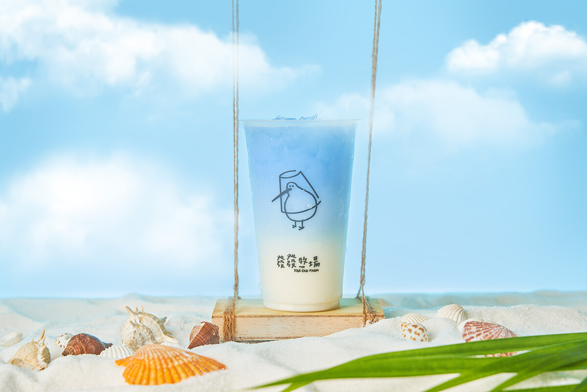 兩款藍色飲品分別是「浪花朵朵蜂蜜優格」以及「晴空朵朵鮮奶茶」,其中「浪花朵朵蜂蜜優格」以招牌雪比生優格為基底,加入100%純蜂蜜點綴,並加入顆粒燕麥以及自製手工鮮奶Q凍,營造出海洋沙灘的視覺意象,喝起來清爽不甜膩。