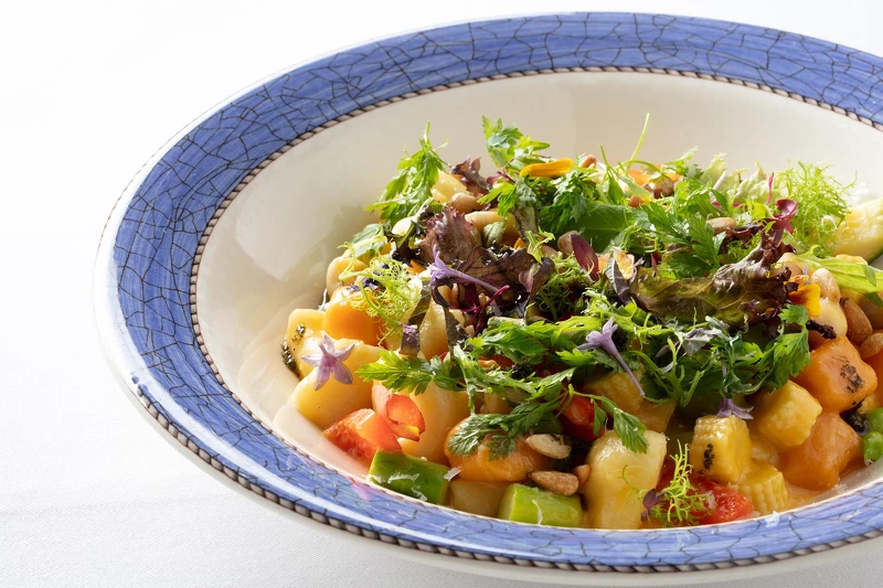 這次無肉菜單活動,阿農主廚想起與簡天才師傅一起前往義大利學習義大利麵條製作的時光,於是延續地中海健康飲食概念發想,以橄欖油、大量蔬果以及起司等來創作。義大利傳統菜式〈義式菠菜餃四種起士醬汁〉將柔軟質地的瑞可塔起司(Ricotta )與菠菜作為內餡,包入杜蘭小麥製成的麵皮,並挑選了4種特色起司製成豐美醬汁:藍紋起司(Blue Cheese)、帕米加諾起司(Parmigiano Reggiano)、奶油起司(Cream Cheese)、塔雷吉歐起司(Taleggio)。