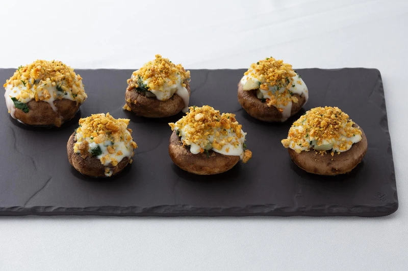 以開胃菜 Tapas 為概念,設計為一口大小,咖哩辛香挑起食慾,飽滿多汁的烤洋菇覆蓋一層來自燕麥奶製成充滿香氣的濃郁白醬,撒上堅果碎與特製麵包粉,香脆爽口。