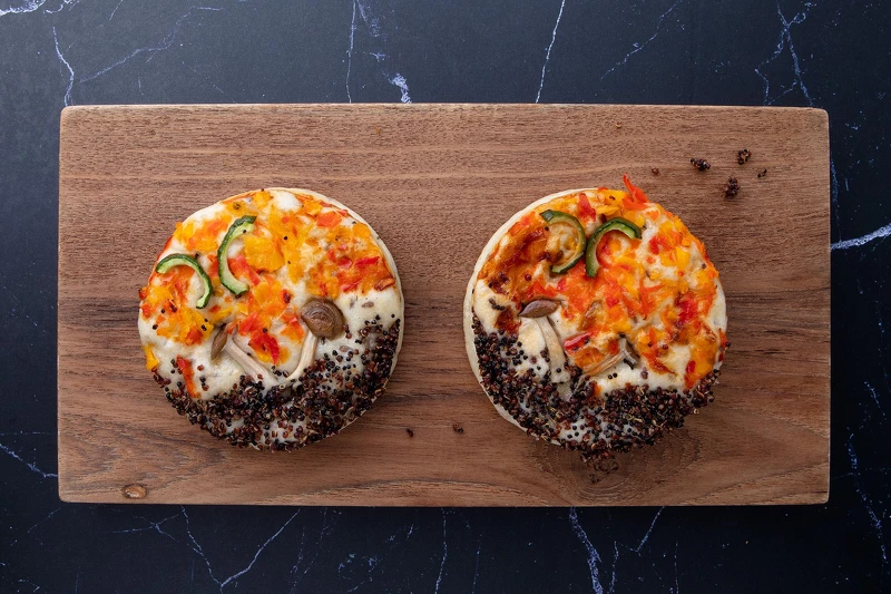 則是昱翰師傅源於「剩食」的概念創作出「盛食」的美味。採用佛卡夏製作工法,麵糰中添加綜合穀物,散發豐富香氣。以黑、紅藜麥為地,彩椒為天,象徵生機盎然的大地,每份食材皆珍稀,都是大地的禮物。