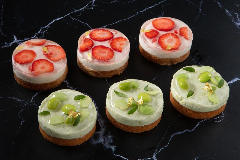 另外甜點師傅湯惠存則以豆腐為主體,做出全素點心!柔嫩的豆腐慕斯飽含豆香,搭配新鮮草莓/毛豆,中間夾餡覆盆子果醬增添酸甜滋味,下方酥餅香酥可口,製程不含蛋奶,全以玄米油製成。