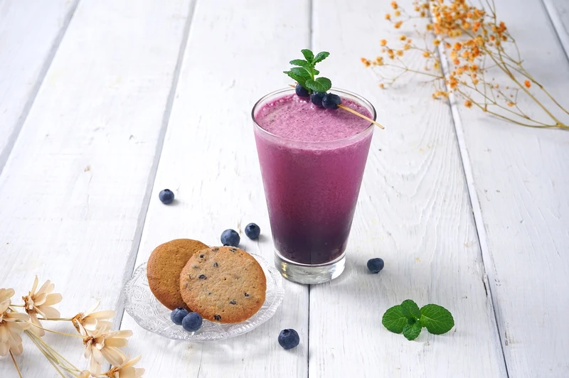 使用義式濃縮咖啡、新鮮藍莓、藍莓果泥及香草高蛋白,再加入Aunt Stella經典巧克力豆餅乾碎,入口感受香甜而不膩口的綿密口感,與藍莓餅乾就是絕配!