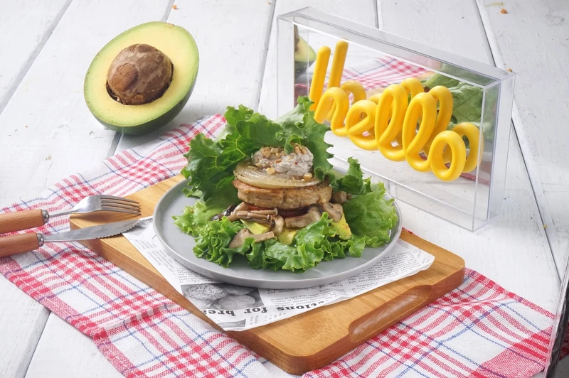 這款豆腐排漢堡為五辛素餐點,漢堡麵包以新鮮美生菜來取代,讓整體風味更清爽,將詩特莉特製蓮藕豆腐淋上特調黑松露豆乳醬,再搭配酪梨、烤洋蔥圈、牛番茄、綜合炒菇與堅果等,讓素食者也能享用獨一無二的蔬食漢堡。