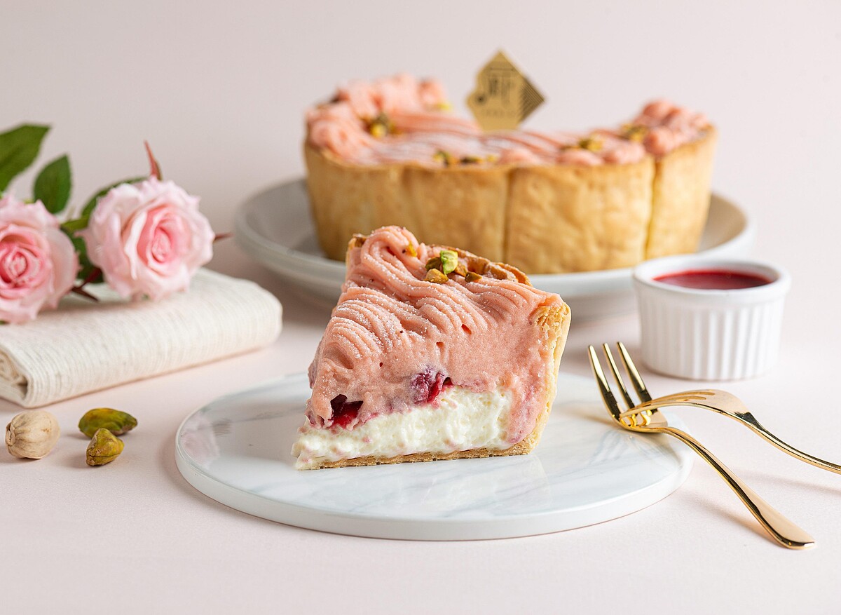 以招牌經典原味起司塔做為內餡基底,再鋪上酸甜清爽的綜合莓果果凍,擠上草莓卡士達鮮奶油,以粉色優美線條交織而成,最後再放上開心果點綴。打造出酸甜醇厚的幸福滋味,尾韻伴隨莓果獨特的清甜香氣,風味層次豐富多變,甜而不膩的口感帶有些許果香,絕對是母親節大餐後的絕佳甜點選擇!