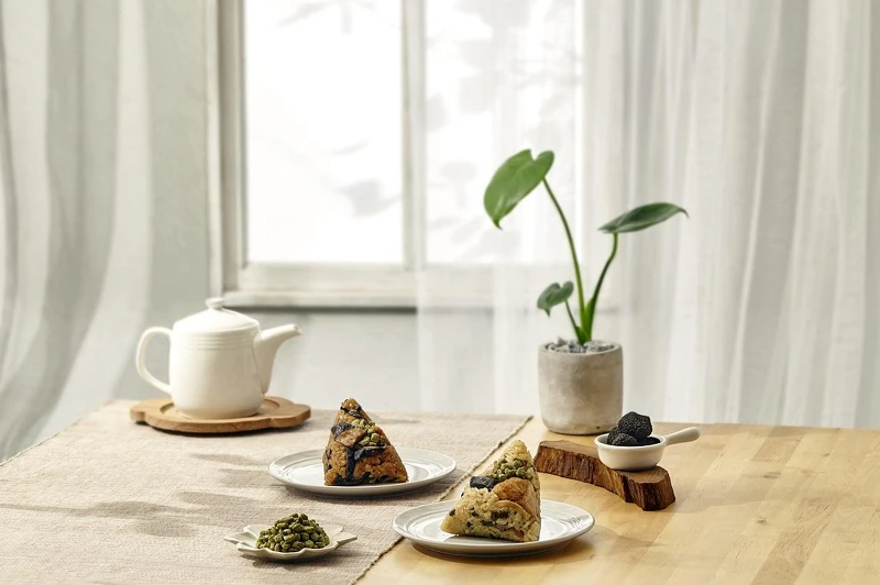 延續去年深受饕客好評的「微藻植物肉粽」被譽為「寶石等級的植物肉粽」!今年再度推出松露微藻植物粽!今年延續吃粽也兼顧環保的理念,將頂級食材松露加入植物素粽當中,推出「松露微藻植物粽」,以松露醬、松露醬油拌入花蓮富里銀川有機長糯白米,並將頂尖生物科技「微藻植物肉」完美融入糯米當中!