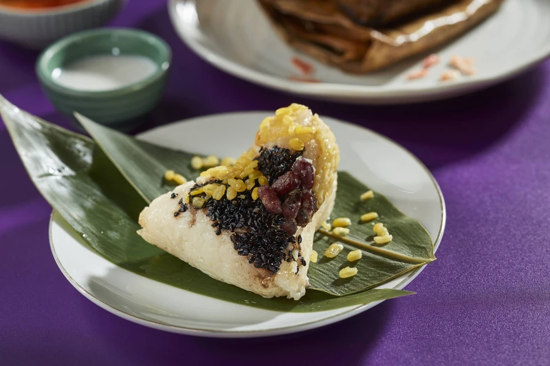 外層包裹著香Q紫米與椰子肉,而內層加入了手工打製的綿密芋泥,再拌入顆粒分明的紅豆粒,增添紅豆香甜風味、口感,再淋上主廚為甜粽特調的南洋椰風香淋醬,最後灑上香酥綠豆仁一起品嚐,每一口都是豐富層次的馥郁甜香!