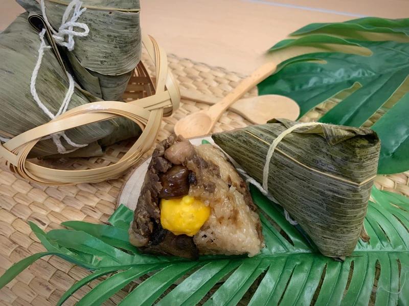 特色端午粽再加一!裹蒸粽以中國廣東古法傳承製作工藝,網羅了北海道干貝、埔里香菇、東港櫻花蝦等珍貴食材,再以冬葉與荷葉包裹在蒸煮兩小時,糯香四溢,令人食指大動!