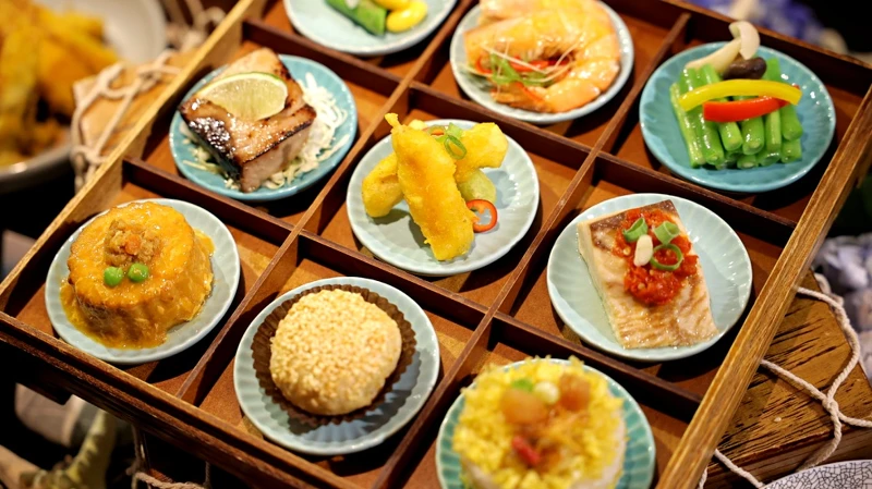 精緻菜色包含炙燒秘製鮪魚、剁椒鬼頭刀、金沙香酥旗魚、蒜味生抽白蝦、山藥蘆筍、蟹粉燒豆腐、野菇四季豆、蘿蔔絲酥餅、新港干貝醬櫻花蝦菜飯,各式鮮美海味與多層次口感,逼人一口接一口!