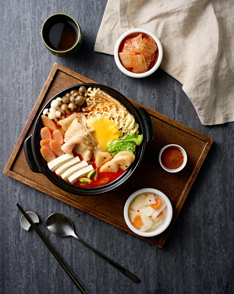 特製的韓式辣醬湯頭,搭配以蘋果醃製的鮮甜爽脆泡菜與年糕、起司、火腿腸,再加入部隊鍋的的靈魂食材「不倒翁拉麵」,多種配料讓人超滿足!