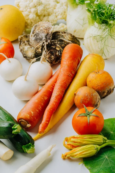 主菜肉類選項:先將珠雞腿、珠雞胸煎至完美的熟度,以台灣的彩色蘿蔔做配菜,先烤過再煙燻,不僅更能呈現蘿蔔香氣及風味,同時也能去除特有的生澀氣息。再配上炙烤巴西蘑菇,非常適合搭配肉質細緻又帶點野味的珠雞。