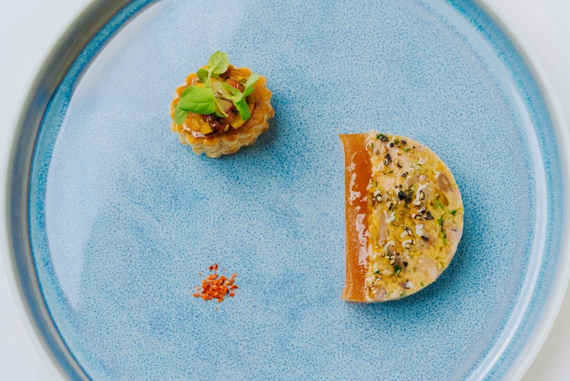 第一道前菜Terrine肉凍是很傳統的法式前菜。以鴨肉為主軸,並以春夏為靈感去調味,加入帶有清新氣息的沙薑,再搭配甜美柔和的茄泥製成肉凍。香酥的松子小酥盒及時蔬,佐以微酸的番茄凍,彷彿打開味蕾開關,期待下一道菜上桌!