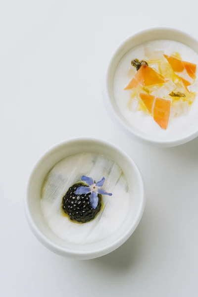 以海與山為題,使用冷和熱不同溫度呈現。選用了來自大海的生蠔,陸地則是使用火腿、春季盛產的肥嫩白蘆筍來象徵山。以豆乳來搭配鮮奶油,讓整體口感更佳輕盈,同時也藉由豆乳的鮮味更能讓食材間緊密連結,創造具有深度的美味。