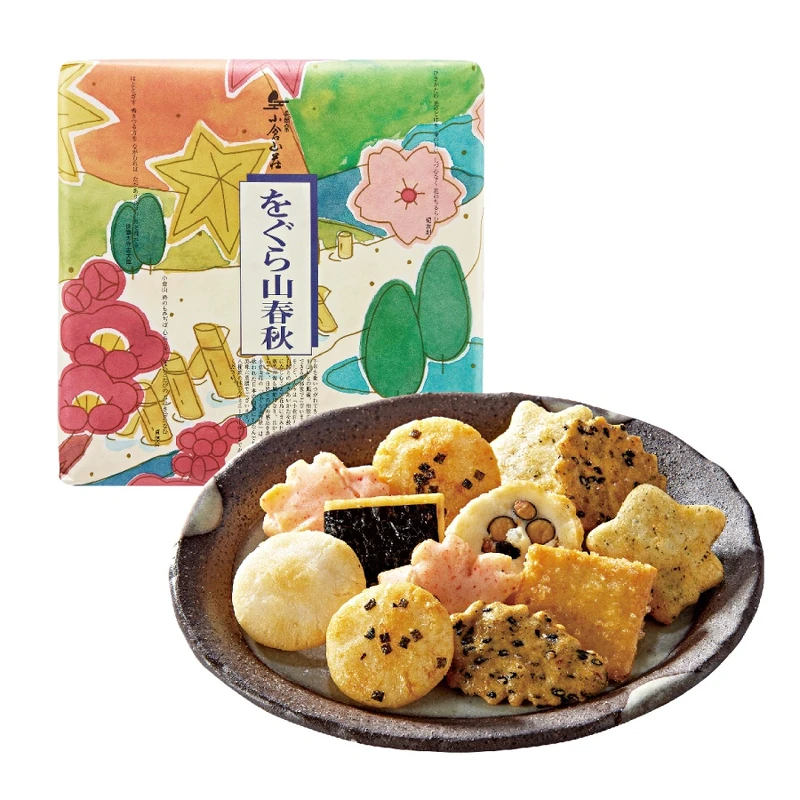 以米菓表現日本四季的「小倉山春秋」是小倉山莊的代表性產品,包裝是充滿高級感的日式圖案設計,每袋裝有8種小米菓,多層次的風味與口感真的超涮嘴!