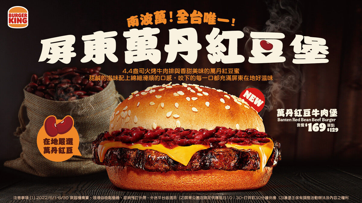 漢堡王宣布正式插旗屏東,全新屏東公園店,店面佔地70坪,這次漢堡王以著名特產萬丹紅豆為主軸,打造出全球唯一的「萬丹紅豆牛肉堡、萬丹紅豆聖代,萬丹紅豆草莓聖代大家準備好嚐鮮了嗎?