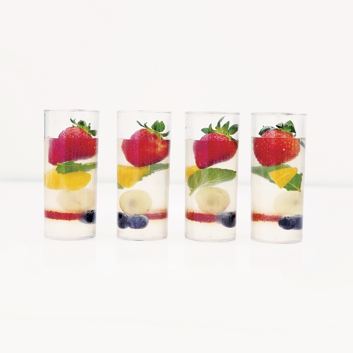 採用當季的新鮮水果,分次將煮沸過的氣泡酒果凍倒入容器裡,製造出水果漂浮在水中的動感,還能表現出水果的新鮮。這是一款製作簡單,只需要冰箱就能完成的宴客甜點。