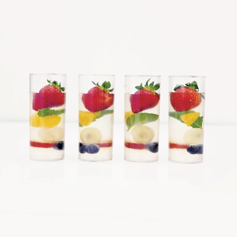 1.事先準備數種水果,在容器中倒入約30g的一、果凍香檳,放入水果等待稍微凝固,製造出漂浮的效果。(圖B-C)