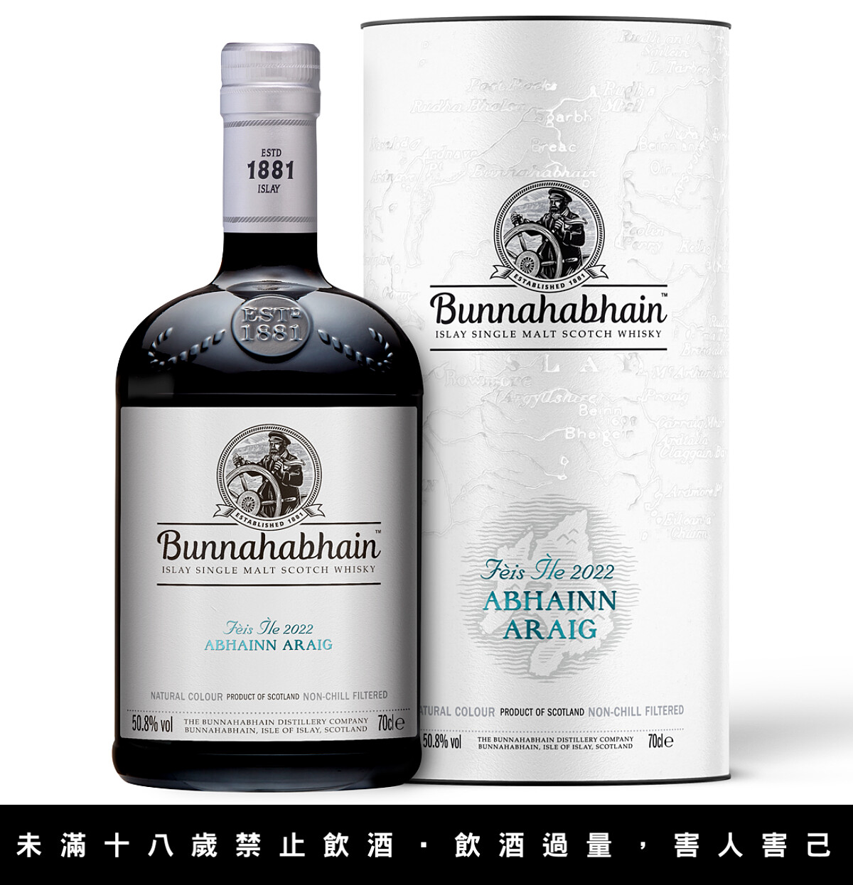 以及創作靈感源於艾雷島河水的「布納哈本生命之水 Abhainn Araig」,此為最典型的布納哈本風格,特色是無泥煤、雪莉桶、大膽創新與層次豐富,與艾雷島其他蒸餾廠著名的煙燻威士忌完全不同,原來,層次豐富的威士忌原酒才能夠承受在雪莉桶中熟成的挑戰,巧克力、薑粉、雪茄的香氣伴隨著天鵝絨般絲滑的口感,尾韻則有太妃糖與巧克力的風味,醇厚且濃郁。