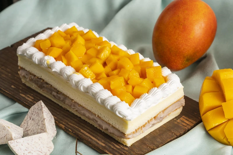 全新的芋頭蛋糕來啦!以柔軟的黃金牛奶蛋糕為基底,在加入厚實的芋泥夾心內餡,頂層霸氣鋪上滿滿的鮮甜芒果,甜而不膩的口感,讓人忍不住一口接一口!