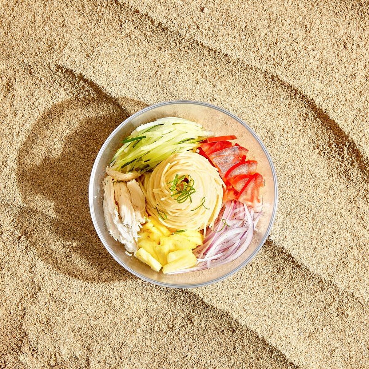 未精緻的杜蘭小麥呈現出天然微黃的色澤,燙煮至剛好的熟度再拌入初榨義大利橄欖油,風味清爽、口感細緻Q彈。「杉法式涼麵」選用法式舒肥主食作為搭配,以法式烹調手法,採低油低鹽調味打造新低溫舒肥料理。再放上色彩繽紛的四色蔬果像是洋蔥紫、小黃瓜、番茄、鳳梨,主食則是選用杉的明星商品蔥油舒肥雞胸肉絲,視覺與味蕾一次滿足!