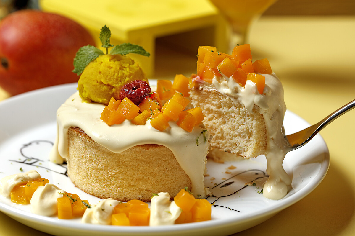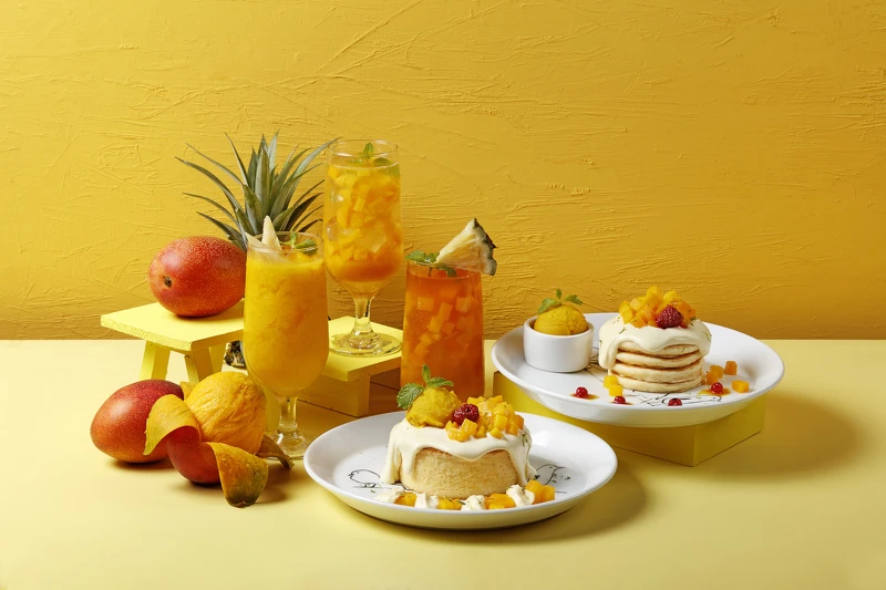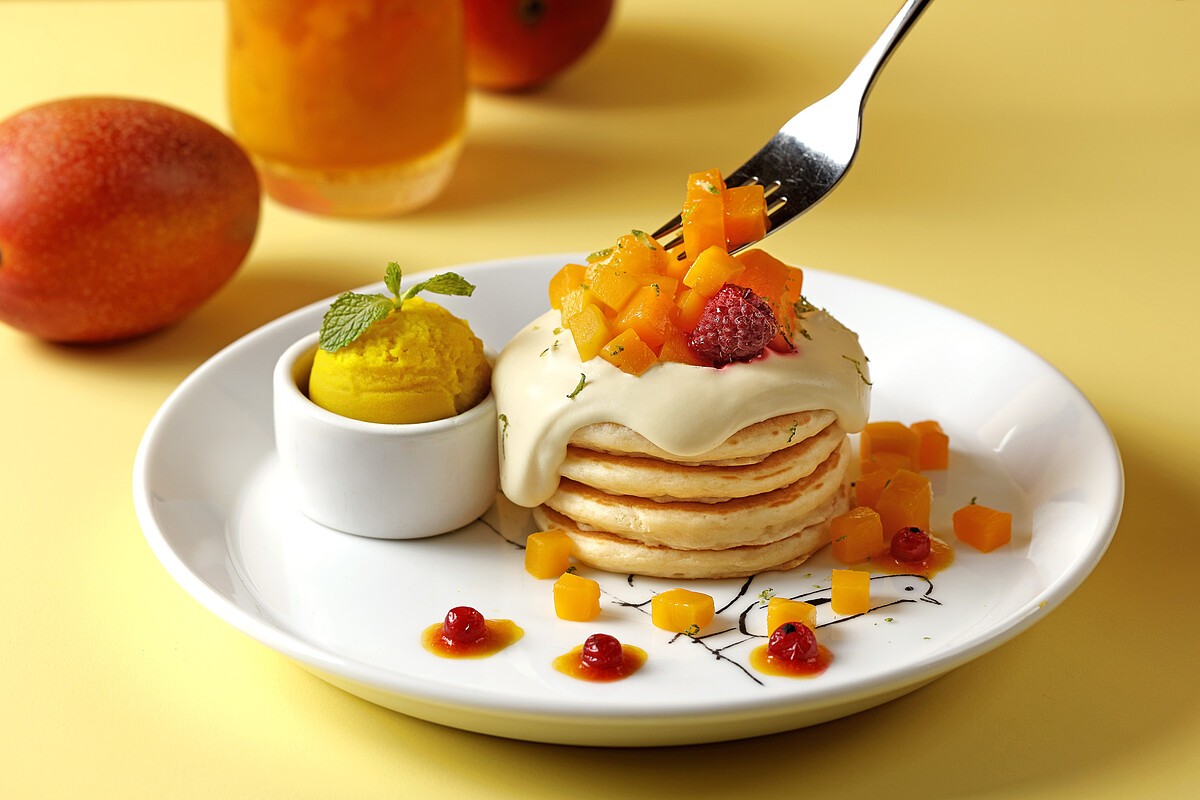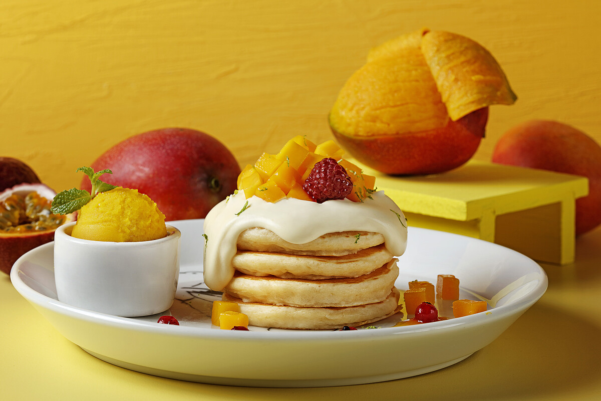 以特製的芒果雪酪搭配新鮮切粒愛文芒果,再加入法國百香果製成的奶霜更增添整體層次風味,入口感受芒果的香甜、百香果的酸香及鬆軟扎實的厚鬆餅口感,每一口都是幸福滋味!
