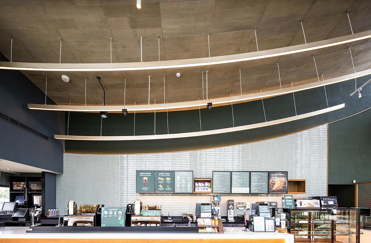 位在台中市北屯區,星巴克「松竹洲際門市」以靈感來自鄰近洲際棒球場與台中巨蛋,並從建築物SHELL TO SHELL的概念為啟發,在殼與殼體的浮空掠影間,運用簡約輕盈的弧線創造出曲線屋頂和牆壁,與自然及周遭相互作用呼應。
