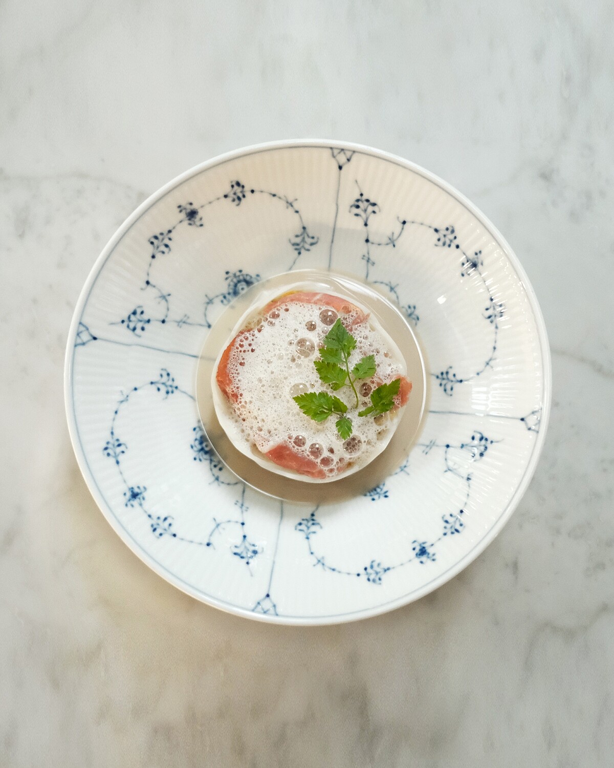 夏天,是絲瓜的季節,這道時髦的法式冷湯是主廚以台式經典的絲瓜蛤蜊作為靈感來源,保留了料理的靈魂又賦予嶄新的創意。 清甜滋味的絲瓜以嫩薑片、蒜頭炒香後加入與適量的水一起煨煮成絲瓜湯,文火慢燉留住了食材的甜味也濃縮了絲瓜風味,放冷後打勻製作成冷湯的基底。搭配上煎的恰到好處的絲瓜塊以及充滿大海風味的蛤蠣肉、新鮮透抽,是對季節最直接的料理呈現。
